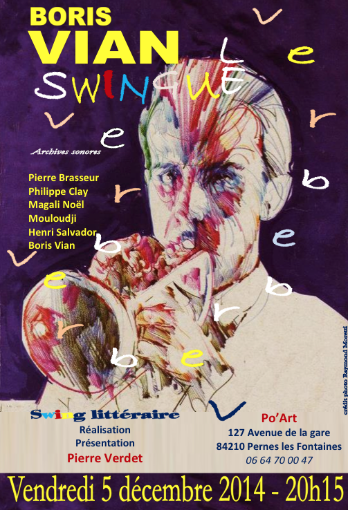 Toujours fidèle à une programmation éclectique à présent reconnue, l’Association Po’Art propose le 5 décembre 2014 à 20h15, (au 127 avenue de la gare à Pernes les Fontaines) un nouvel opus intitulé « Boris Vian swingue le verbe ». Aux commandes de cette soirée, Pierre Verdet, dont on ne présente plus le travail de réalisation et d’investigation. Disparu à trente-neuf ans, Boris Vian n’aura pas moins vécu plusieurs vies. Ses multiples visages, du romancier au compositeur en passant par le musicien ou le chroniqueur, l’ont élevé au rang de mythe. Figure de proue de Saint Germain des Prés et des belles années de l’existentialisme, jazzman inspiré ou pataphysicien émérite, Vian le Caméléon a fait du travestissement un art et de son existence une danse permanente. Ces vies multiples de Boris Vian seront illustrées par des documents rares, des enregistrements rock and roll qui feront de cette soirée non pas une soirée littéraire, mais un swing littéraire inédit ouvert au plus grand nombre dans une joie et allégresse partagées.