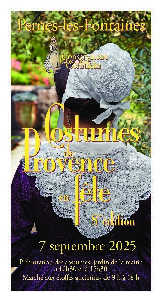 Le Conservatoire du Costume Comtadin propose sa 8° édition de "Costumes de Provence en fête" qui se tiendra le 7 septembre de 10h30 à 18h, dans les jardins de la mairie.