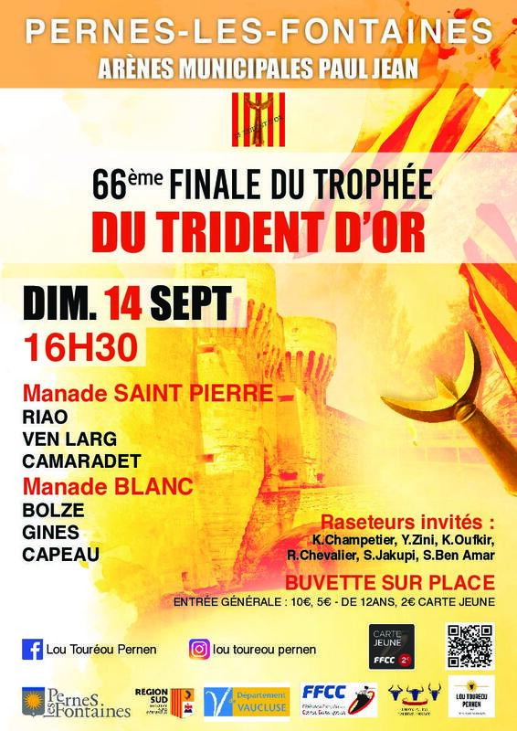 Le club pernois "Lou toureou Pernen" accueil la 66ème finale du Trophée du Trident d'Or aux arènes municipales Paul Jean ! à partir de 16h30 le 14 septembre 2025.