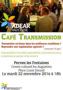 l'ADEAR propose un CAFE TRANSMISSION à 18h. Ce temps d'échanges autour de la transmission-installation en agriculture vous est proposé à vous qui pensez un jour transmettre votre ferme et à vous qui souhaitez vous installer en agriculture.