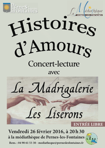 Les chants Renaissance de la chorale "La Madrigalerie" se mélangeront aux lectures de textes choisis par "les Liserons de Pernes" : un spectacle polyphonique qui traverse les époques avec comme fil conducteur : l'Amour ! A 20h30 à la Médiathèque. Entrée libre, places limitées.