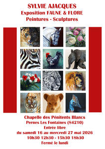 Du samedi 16 mai au mercredi 27 mai de 10h30 à 12h30 et de 15h30 à 18h30, venez découvrir une exposition de Peintures et sculptures sur le thème de la faune et la flore par Mme Sylvie Ajacques.