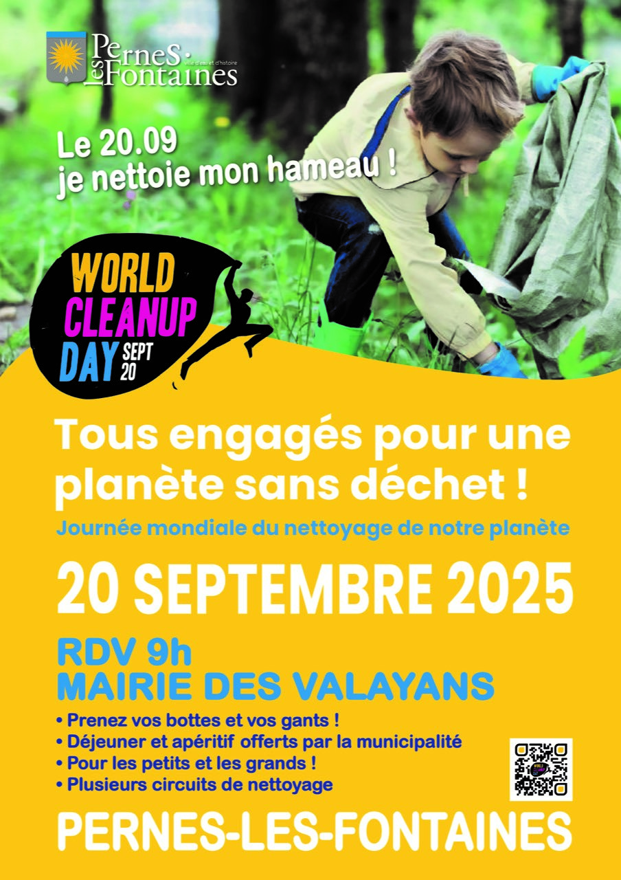 A l'occasion du World CleanUp Day ou journée mondiale du nettoyage de notre planète, la ville de Pernes-les-Fontaines et l'association La Nesque Propre vous donnent RDV le samedi 20 septembre sur le parking de la médiathèque ou à la mairie des valayans pour nettoyer notre belle ville et sa campagne.