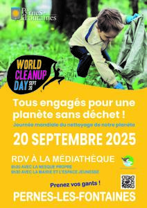 A l'occasion du World CleanUp Day ou journée mondiale du nettoyage de notre planète, la ville de Pernes-les-Fontaines et l'association La Nesque Propre vous donnent RDV le samedi 20 septembre sur le parking de la médiathèque ou aux valayans pour nettoyer notre belle ville et sa campagne.