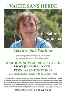Lecture « Vache sans herbe » de Sabine Tamisier par la bibliothèque municipale et la société de lecture pour adultes et enfants à partir de 10 ans à 19h à l’espace jeunesse municipal.