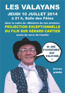 Projection exceptionnelle du film sur Gérard Cartier dans le cadre de « Mémoire de nos anciens » à 21h dans la Salle des Fêtes des Valayans. Entrée gratuite