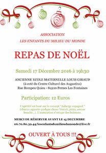 L'association "les Enfants du Milieu du Monde" organise un repas de Nöel, ouvert à tous, sur le concept "auberge espagnole" à 19h30 dans l'ancienne école maternelle Louis Giraud. Participation : 12€