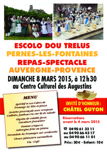 Repas spectacle folklorique provençal et auvergnat par les groupes L’Escolo Dou Trelus et les Brayauds à 12h au Centre Culturel des Augustins. Prix : 30 € (10 € pour les enfants). Réservations avant le 4 mars.