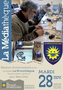 Ce rassemblement aura pour but d’exposer les futurs ateliers que l’équipe de la médiathèque et La Bricothèque vont mettre en place en début 2018. Il permettra aussi à celles et ceux qui n'avaient pas pu être présents à la réunion du mois de Juin, de venir rencontrer les membres du Fablab pour échanger et enrichir ce beau projet commun.