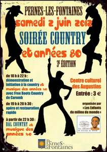 Soirée Country et années 80 par «Les Enfants du Milieu du Monde» avec le groupe « Free Boots Country» et la participation d'autres clubs, au Centre Culturel des Augustins à partir de 18h. Buvette, petite restauration. Entrée : 3 €.