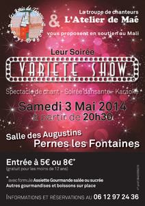 Soirée « Variété show » en soutien au Mali avec spectacle de chant, soirée dansante & karaoké proposée par l’association « les Amis de Tiogou et du Pays Dogon » avec la troupe de chanteurs « l’Atelier de Maé » partir de 20h30 au Centre Culturel des Augustins.