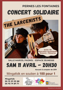 Mingafolk, vous propose ce samedi à 20h30, un concert solidaire en en soutien à l’association "100pour1Vaucluse" avec The Larcenists. Rendez-vous à la salle M. Pagnol à L'Espace Jeunesse de Pernes.