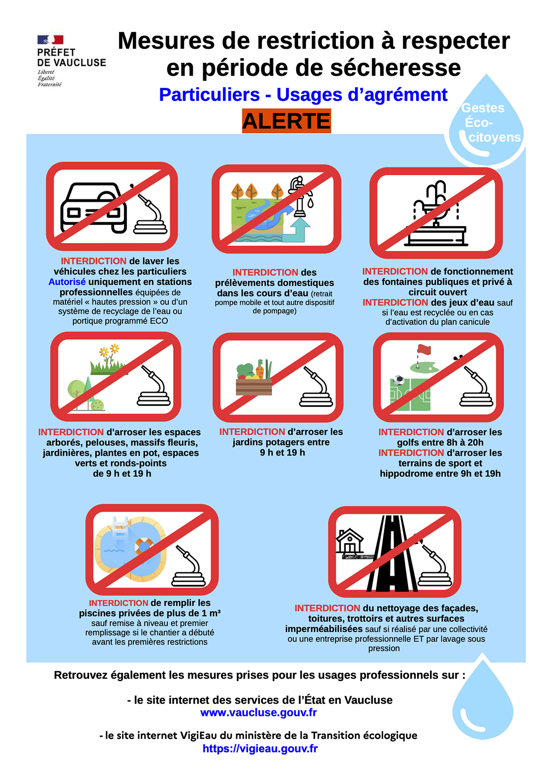 Le constat d'une évolution défavorable des conditions hydrologiques observées fin juin sur l'ensemble du département de Vaucluse et les prévisions météorologiques (pluviométrie et températures) ne permettent pas d'envisager, à court terme, une amélioration durable de la situation hydrologique. Il convient donc de sensibiliser les usagers de l'eau sur la dégradation progressive des ressources en eau et sur le passage en situation de vigilance jusqu'au 31 octobre 2025 inclus.